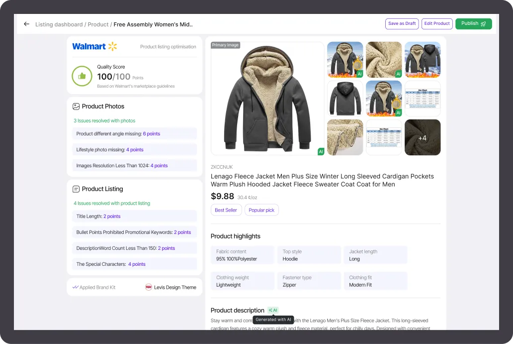 Phot.AI copilot helps you create SEO-rich Walmart titles, descriptions, and attributes, customizing every detail as you like. Now, spend less time creating listings and more time selling on Walmart!