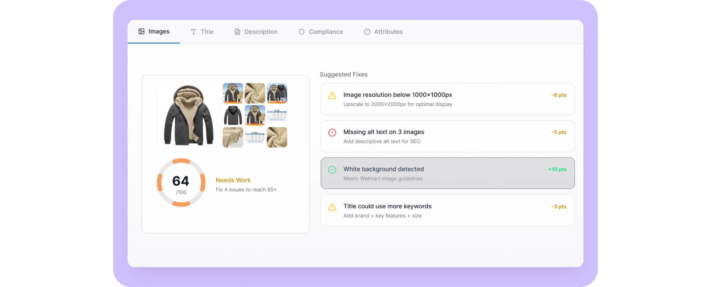 Understand exactly what’s affecting your product listing score with actionable AI suggestions for improvement.